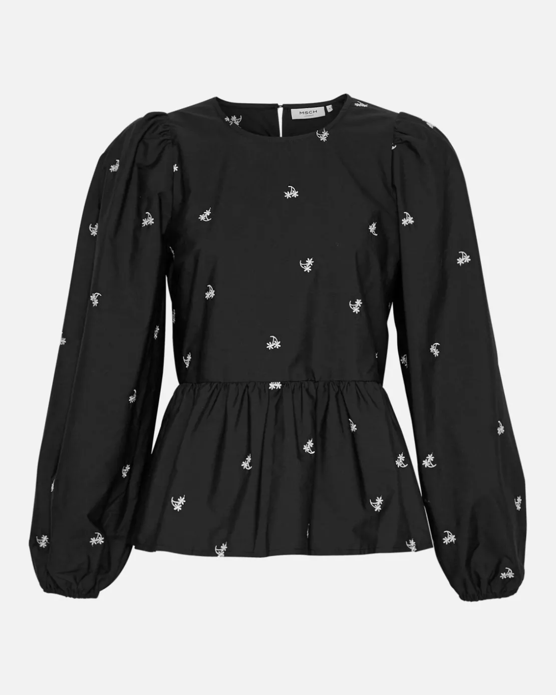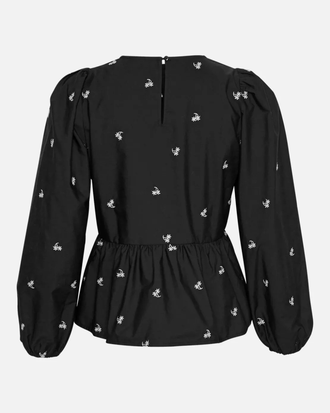 Our Berninette top is crafted with meticulous attention to detail, and is embroidered with small white flowers. The peplum silhuette is a feminine style top with a small “skirt” making the top seem very floaty.