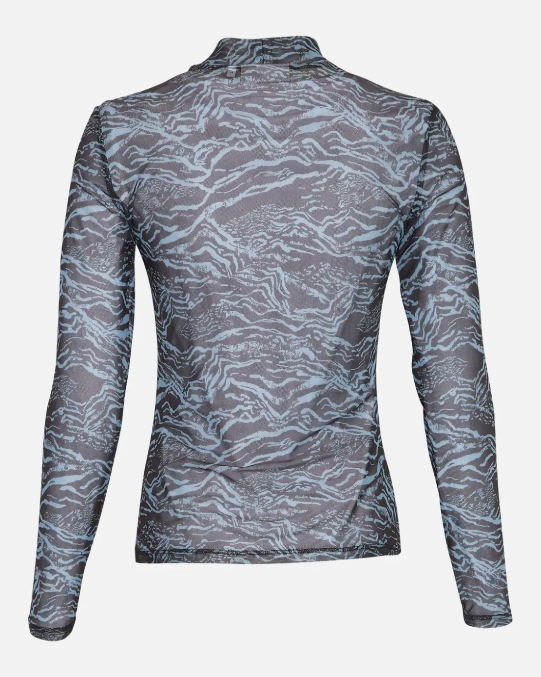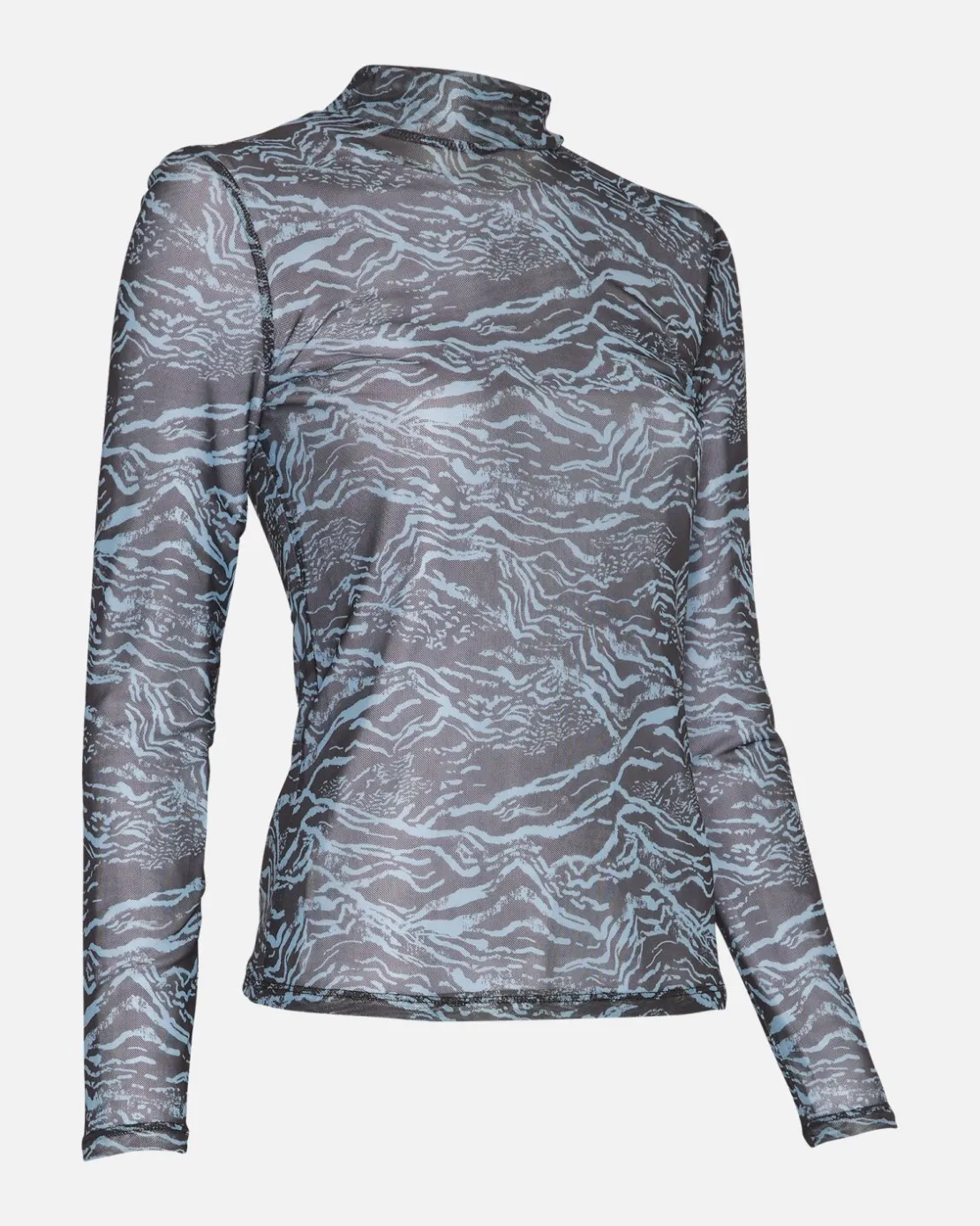 This mesh top has a mock neck, long sleeves and a slim fit.