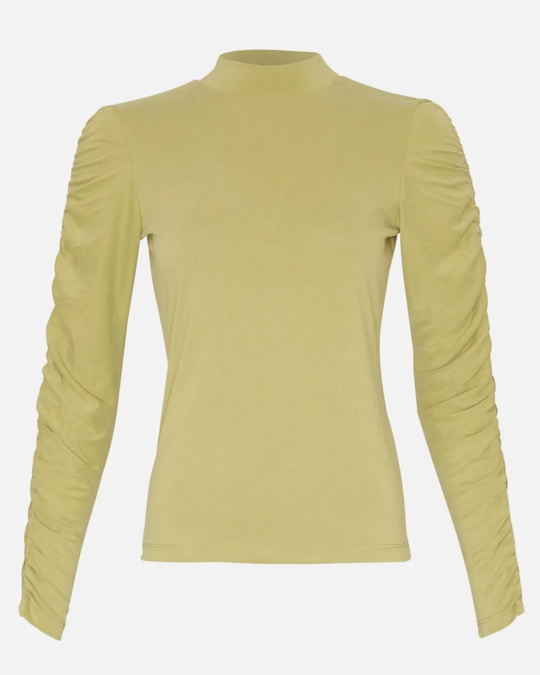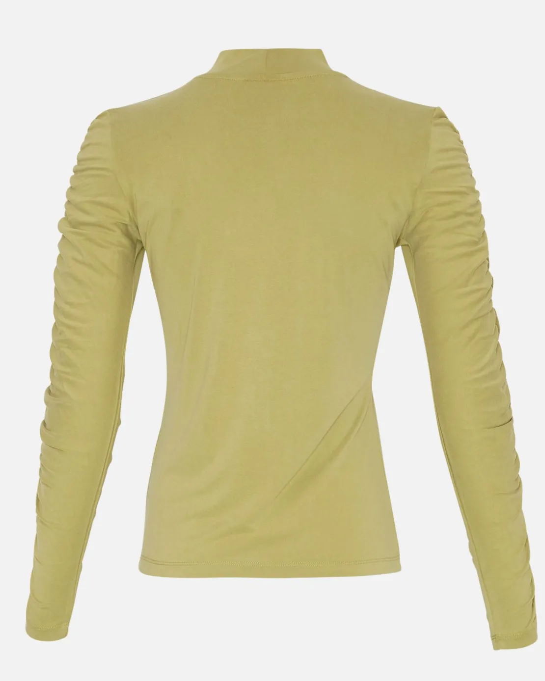 This top has a tight fit, with a high neck and gatherings all the way down the sleeves.