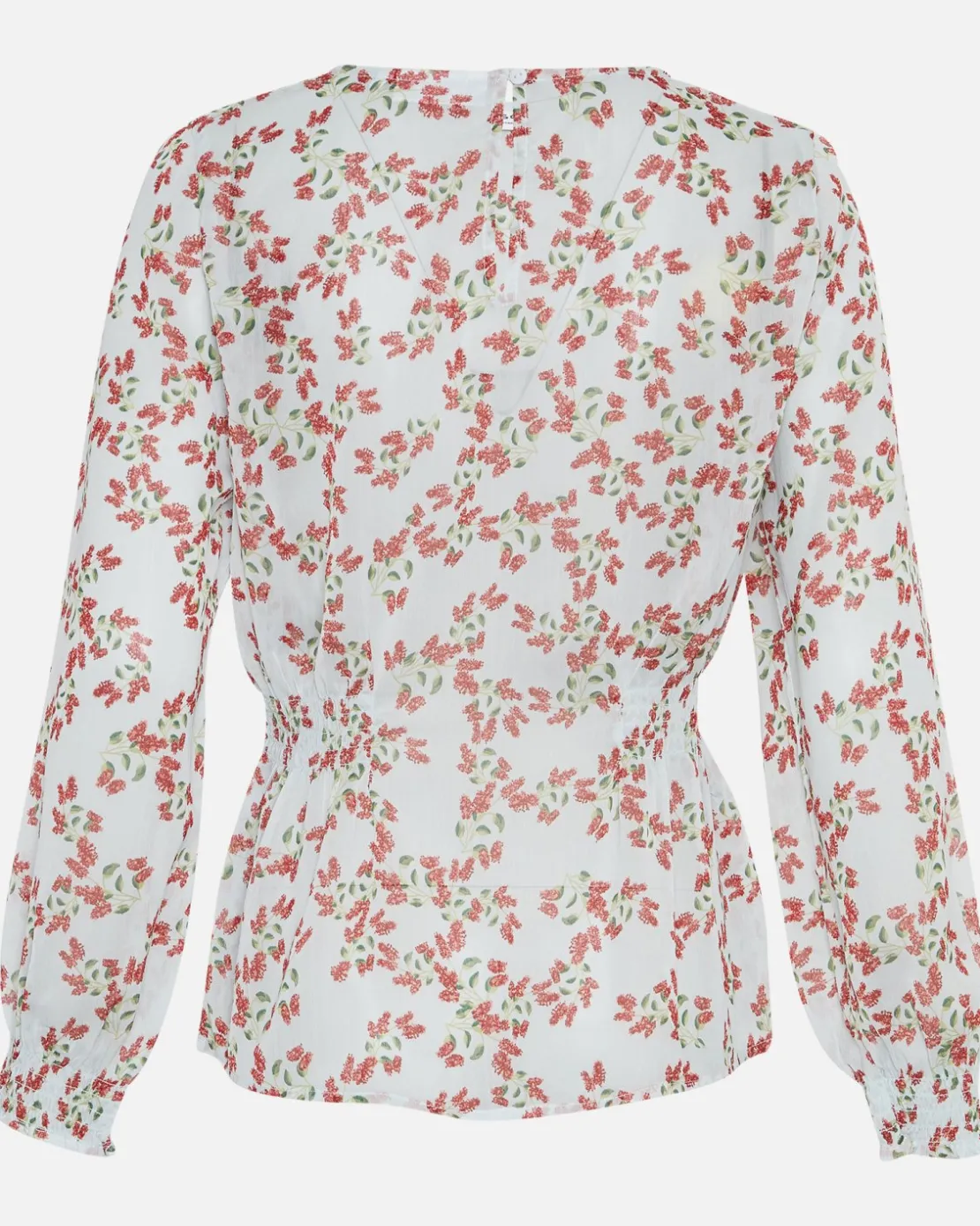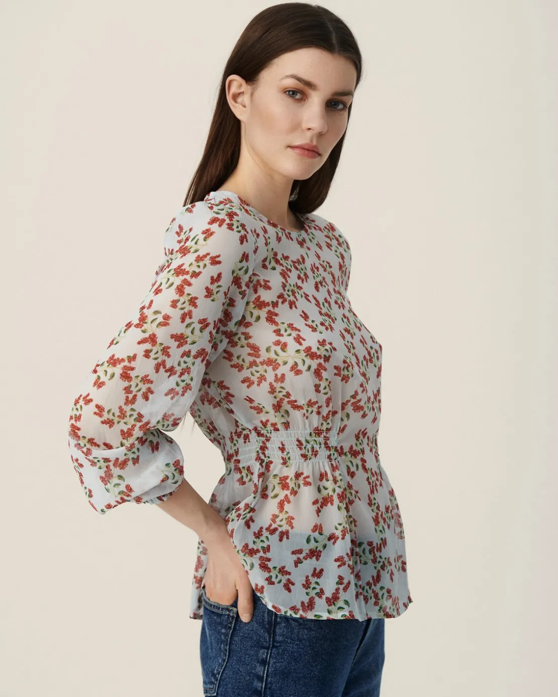 The Satina top features a smock detail with an O-neck and a modern print.