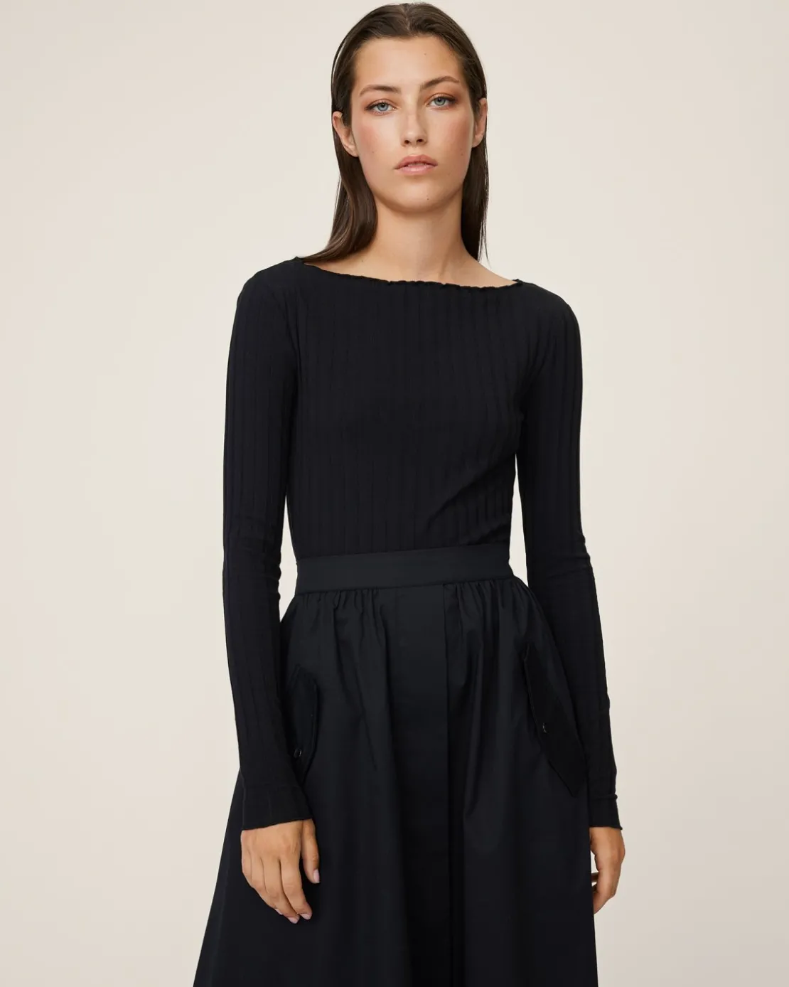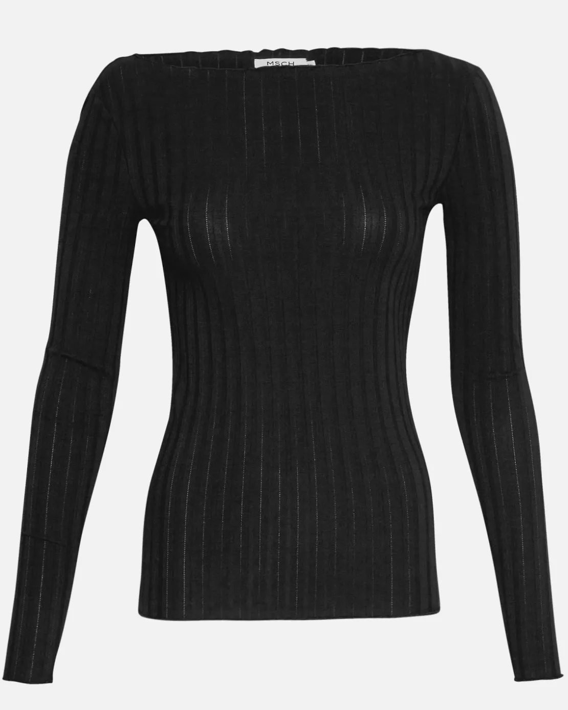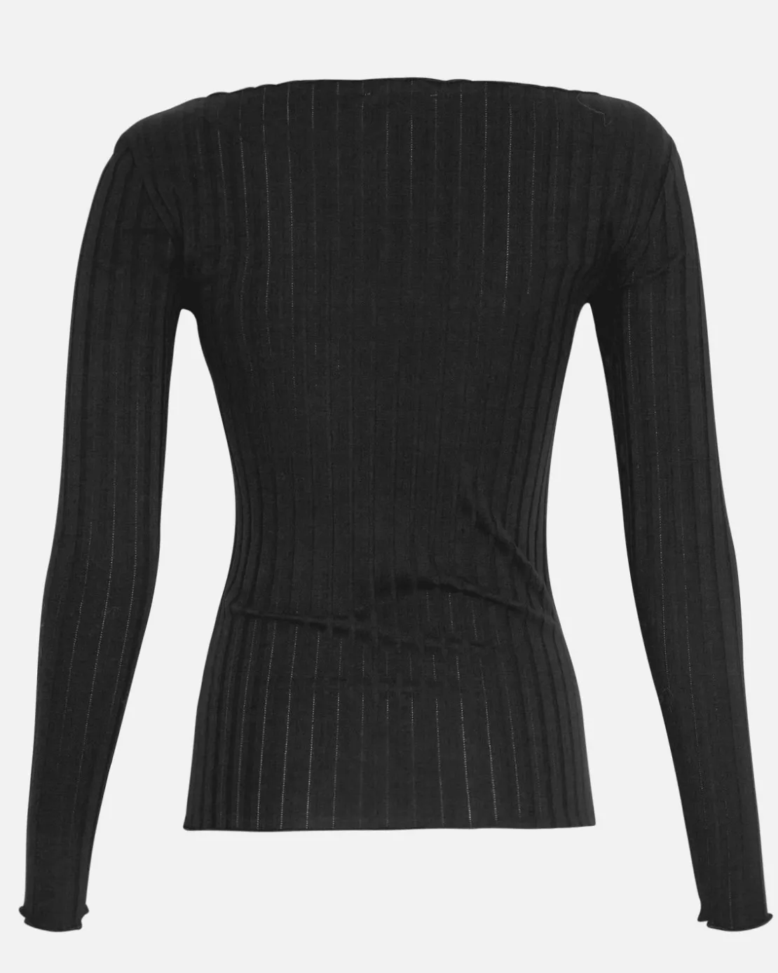 This top features a classic boat neck with a twist of romantic frill finish both at the neck and at the sleeves. Crafted form a nice ribbed jersey fabric, it offers a soft and comfortable feel against your skin, making it ideal as an everyday top or as part of a polished outfit by pairing it with a chic skirt. Elevate your outfit with this foundational top and make a statement with this classic piece.