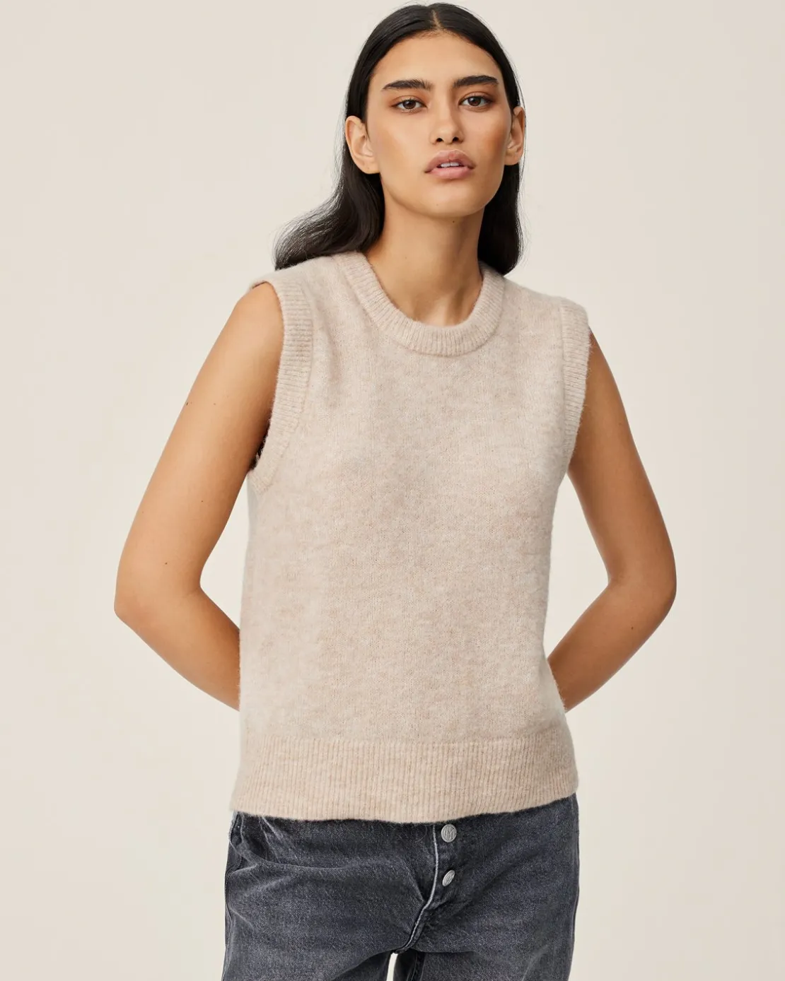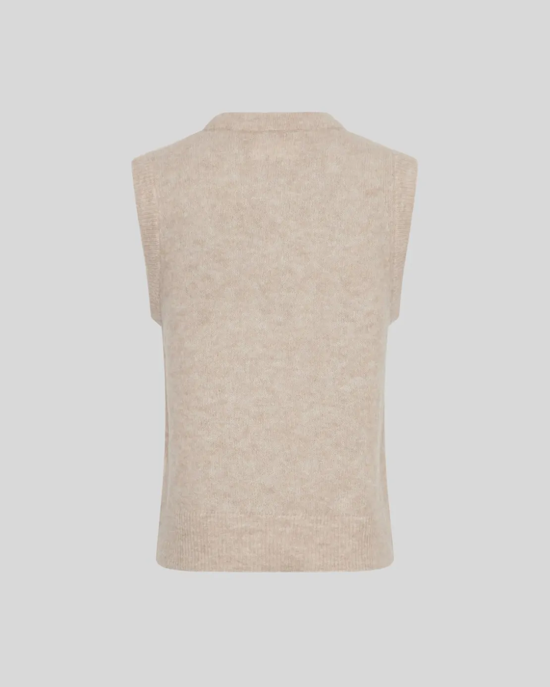A classic knitted vest is coming back in trend. It’s the stunning combination of simplicity, genderless, knitwear. This vest features an elegant regular fit, with a round neck, and ribbed egde both at neck, sleeve openinge and the bottom. Style it with both skirts and pants.