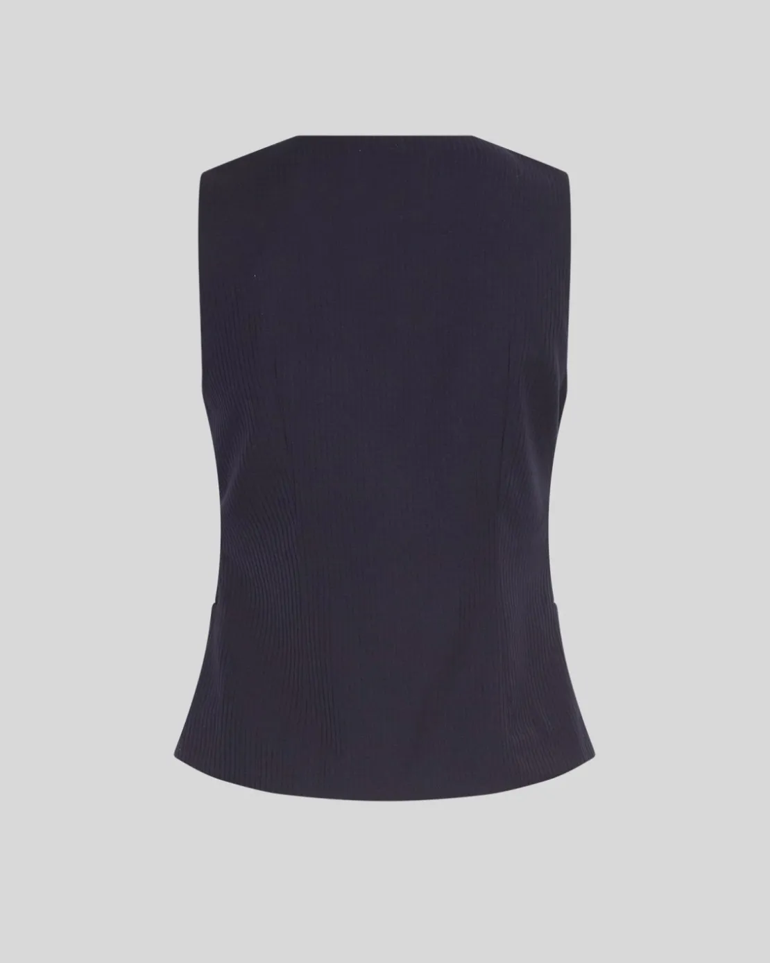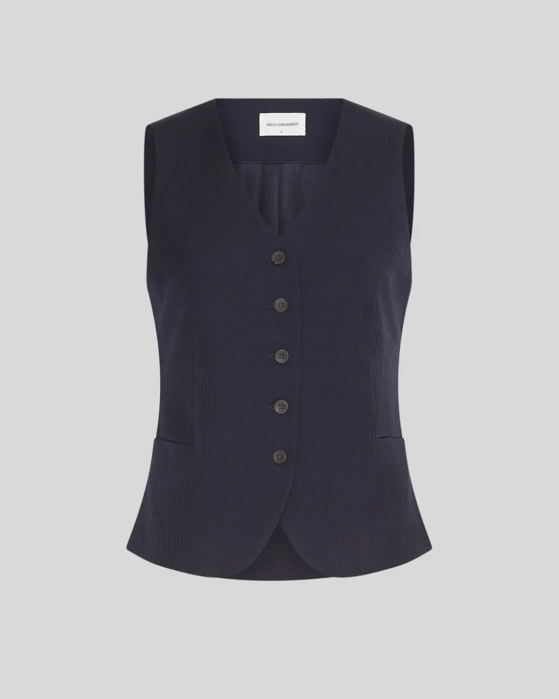 Maelynn is a new collection and is a formal, suit collection. The material is a royal blue with darker stripes. This vest is figure fitted, with a v-neckline and has front pockets. There is two pairs of suit pats and a blazer to match.